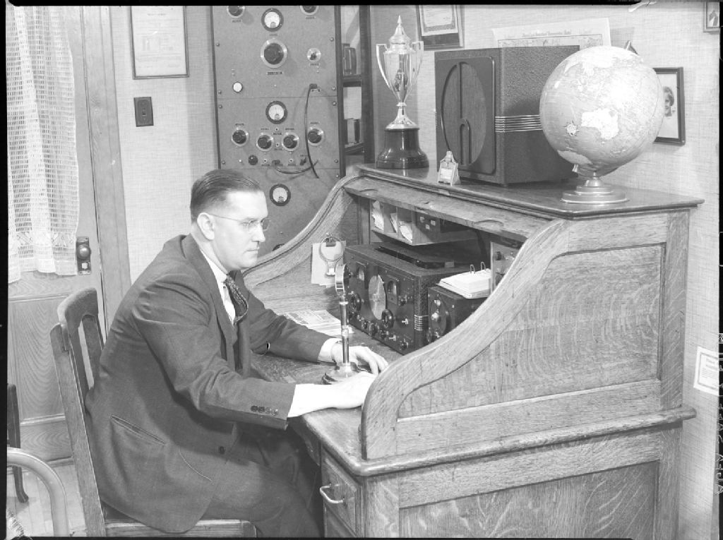 Nous voyons l'intérieur d'une station de radio amateur chez monsieur S. Comach, 780, rue Brault à Verdun. Nous apercevons S. Comach assis devant un micro et un poste émetteur placés sur un secrétaire