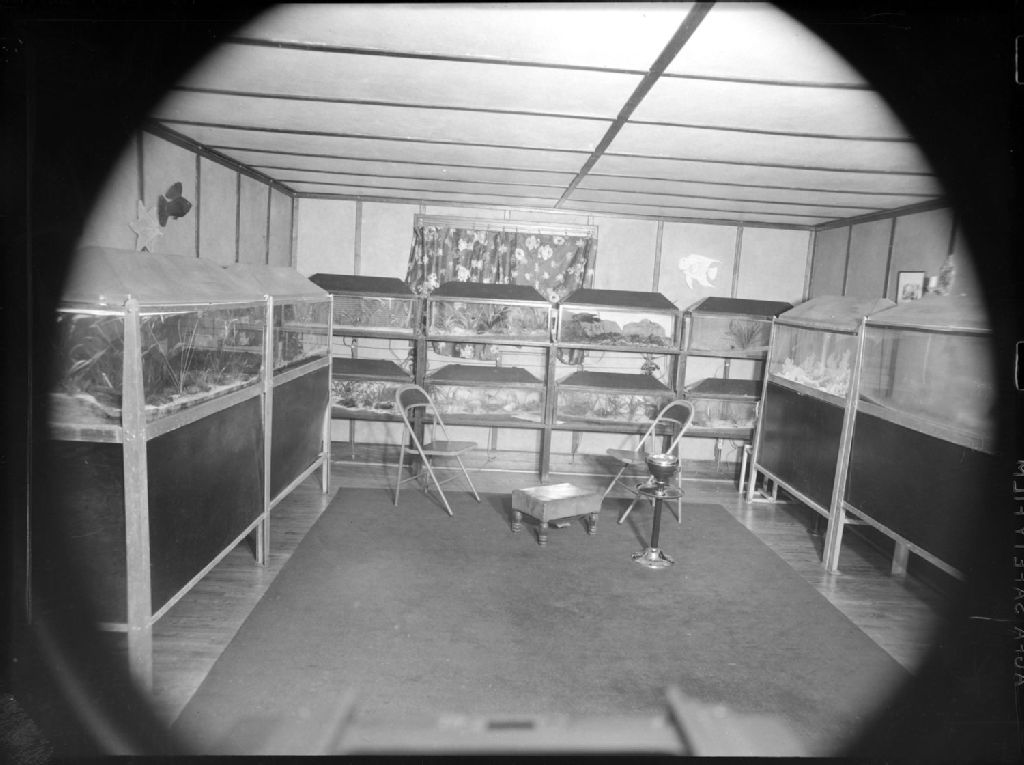 Nous apercevons un plan d'ensemble sur les installations d'un vivarium chez Monsieur Lees, 3535, avenue Grey à Montréal. Nous remarquons une série d'aquariums superposés et disposés autour d'une pièce