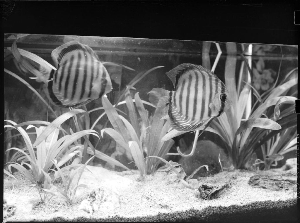 Nous voyons deux spécimens de poissons exotiques à rayures appelé «Symphysodon Discus» faisant partie de l'aquarium Monsieur Lees, 3535, avenue Grey à Montréal
