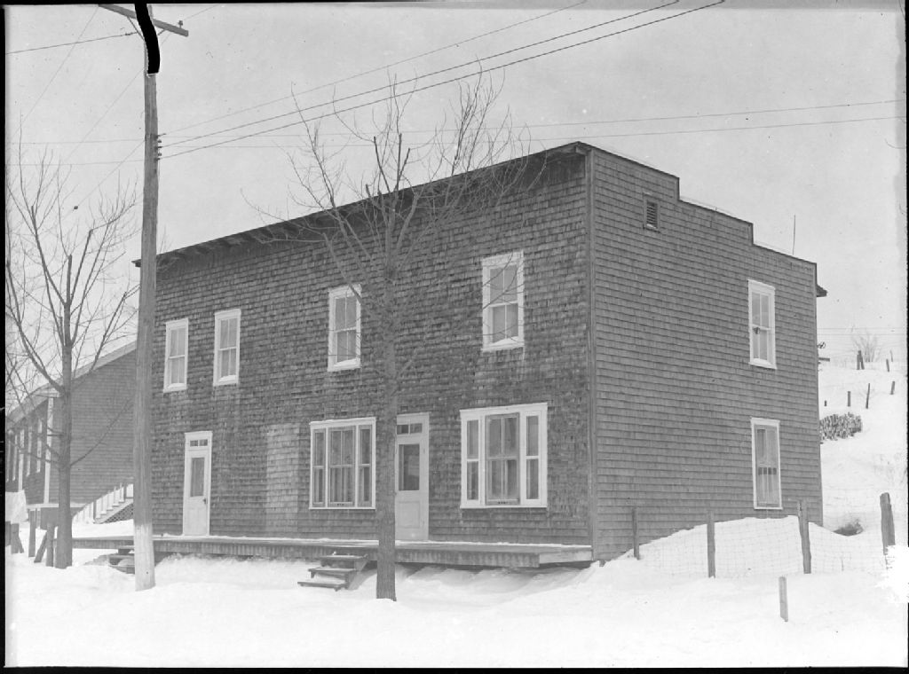 Nous voyons la maison de l'artiste Cyrille Péloquin dans la municipalité de l'Annonciation au Québec. Il s'agit d'une maison recouverte de bardeaux de cèdre, à deux étages et à toit plat