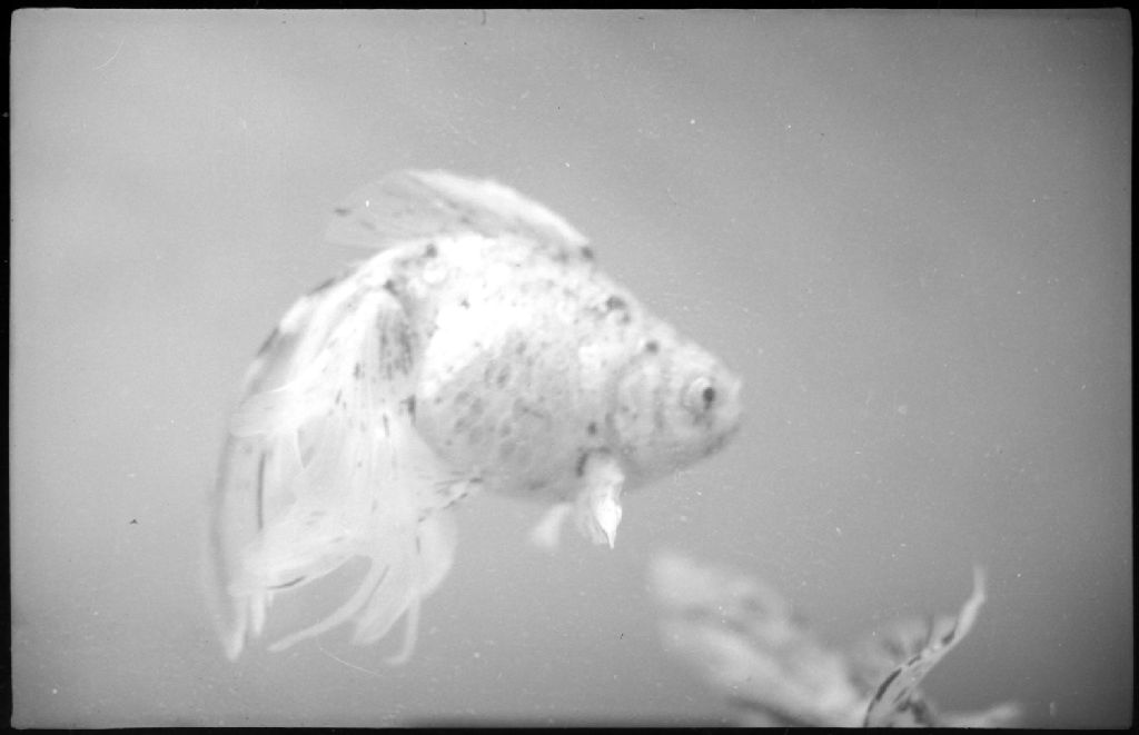 Nous voyons dans un aquarium un spécimen de poisson exotique à motifs tachetés et longues nageoires appelé «Calico Fantail» faisant partie de l'aquarium de Monsieur Lees, 3535, avenue Grey à Montréal