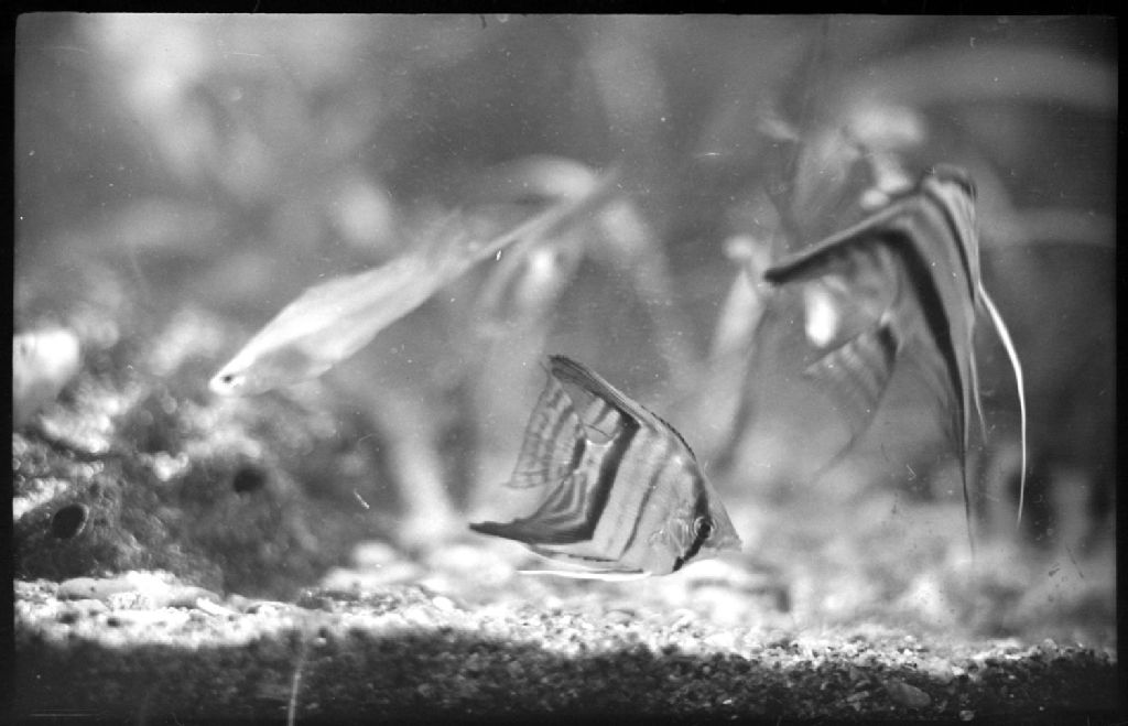 Nous voyons dans un aquarium divers spécimens de poissons exotiques à rayures faisant partie de l'aquarium de Monsieur Lees, 3535, avenue Grey à Montréal