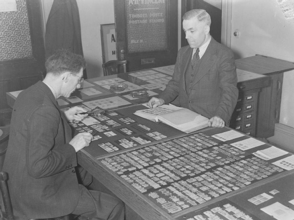 Nous apercevons le philatéliste A. H. Vincent debout derrière le comptoir de sa boutique spécialisée située au 294, rue Sainte-Catherine Ouest à Montréal, à l'intersection de la rue Bleury, en compagnie d'un client. Nous remarquons de nombreuses pièces de collection exposées ainsi que de menus objets servant à leur manipulation