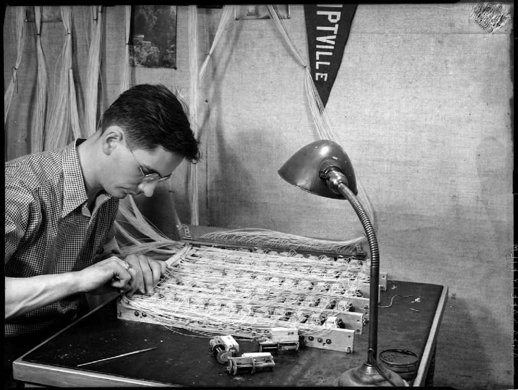 Nous voyons Monsieur Rawling assis à un table dans son atelier ajustant le câblage électrique d'un orgue électrique à tuyaux en cours de facture