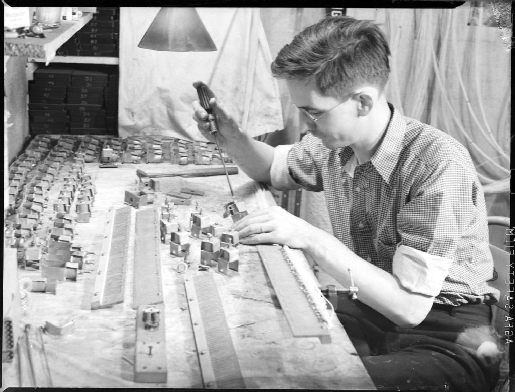 Nous voyons Monsieur Rawling dans son atelier ajustant à l'aide d'un tournevis les valves des solénoïdes de son orgue électrique à tuyaux
