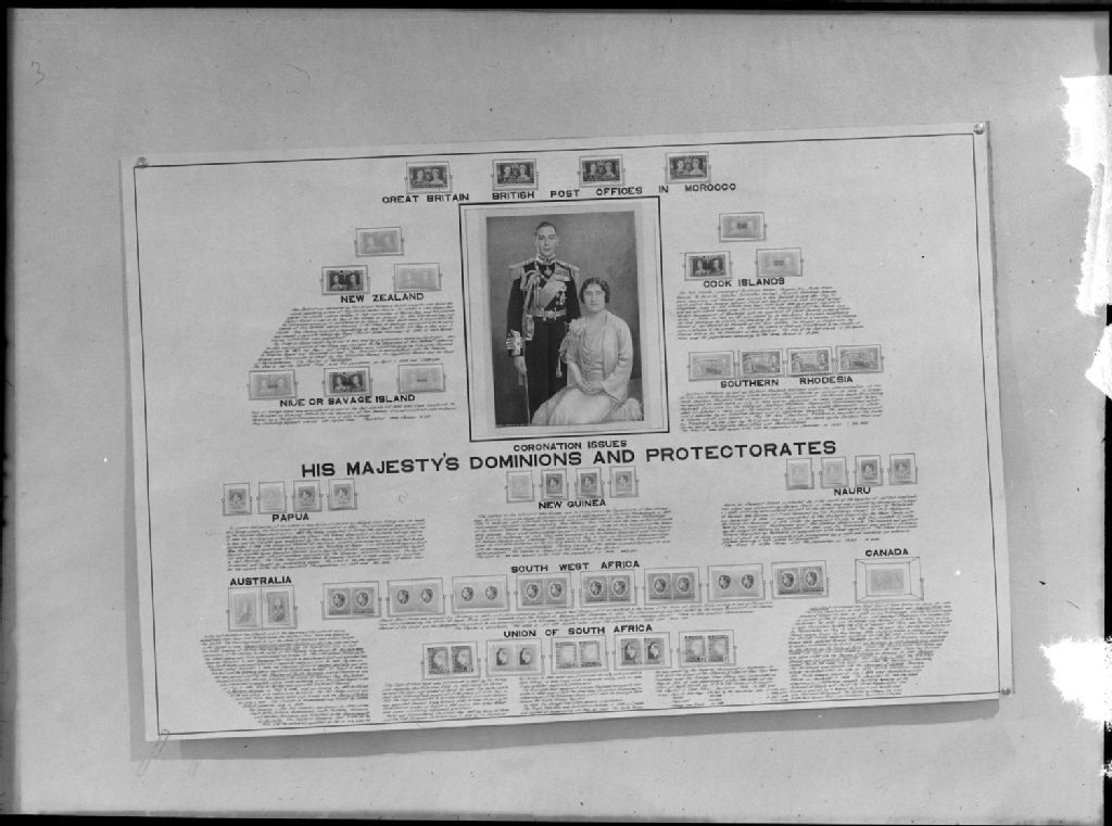 Nous apercevons, exposée par le club de philatélie de Westmount, une série de timbres en provenance des dominions et protectorats de la Grande-Bretagne, avec au centre une photographie du couple royal