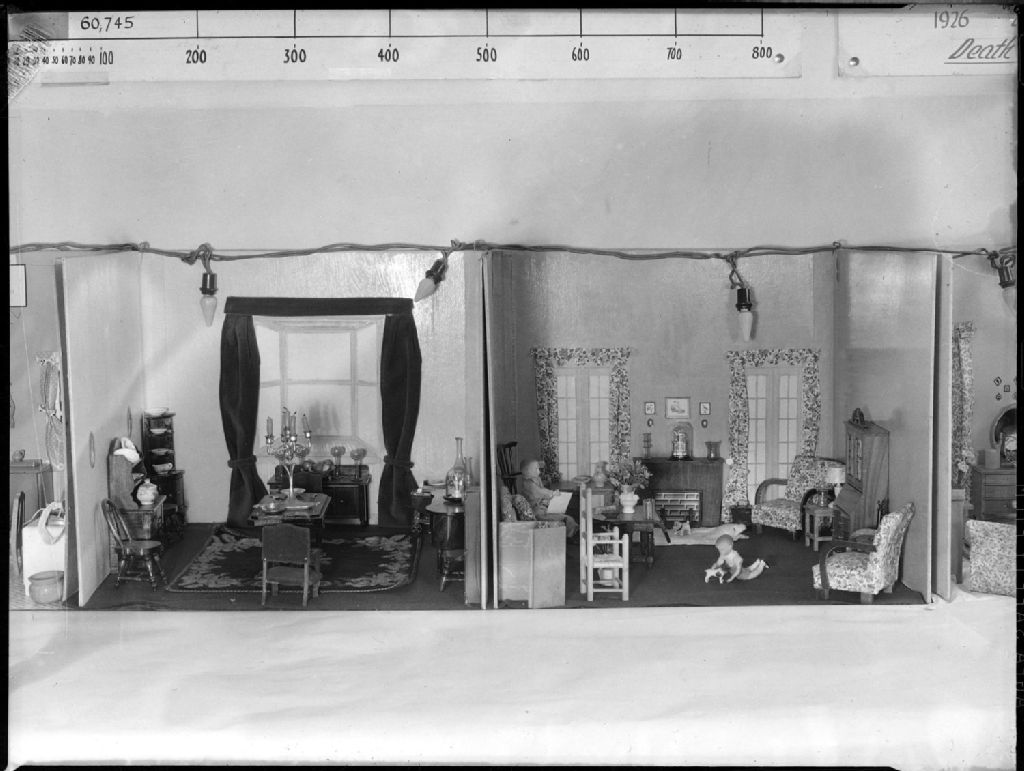 Nous voyons le salon et la salle à manger d'une maison de poupée. Ces objets, réalisés par Anne Bone, 13 ans, ont été présentés à l'exposition de passe-temps de Westmount