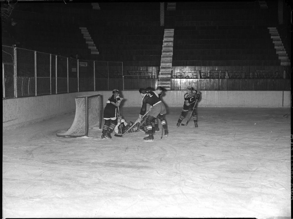 Nous voyons des adolescents jouant au hockey sur une patinoire intérieure. Ces jeunes sont de la "Daniel O'Connell School" et de la "Catholic High School", deux écoles de Montréal