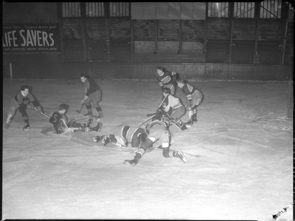 Nous voyons des jeunes hommes jouant au hockey sur une patinoire intérieure. Il s'agit d'élèves de la "St. Leon Academy" de Westmount et de la "D'Arcy McGee High School" de Montréal