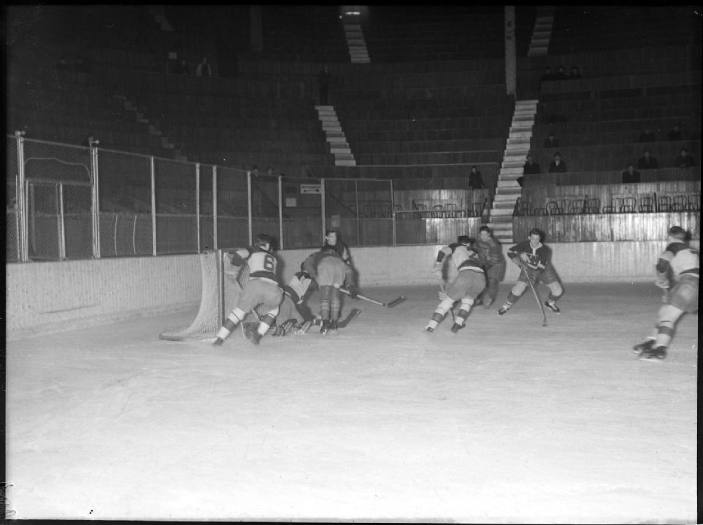 Nous voyons des jeunes hommes jouant au hockey sur une patinoire intérieure. Il s'agit d'élèves de la «West Hill High School» de Montréal et de la «Westmount High School Academy» de Westmount. Des joueurs se disputent la rondelle dans la zone des buts de West Hill