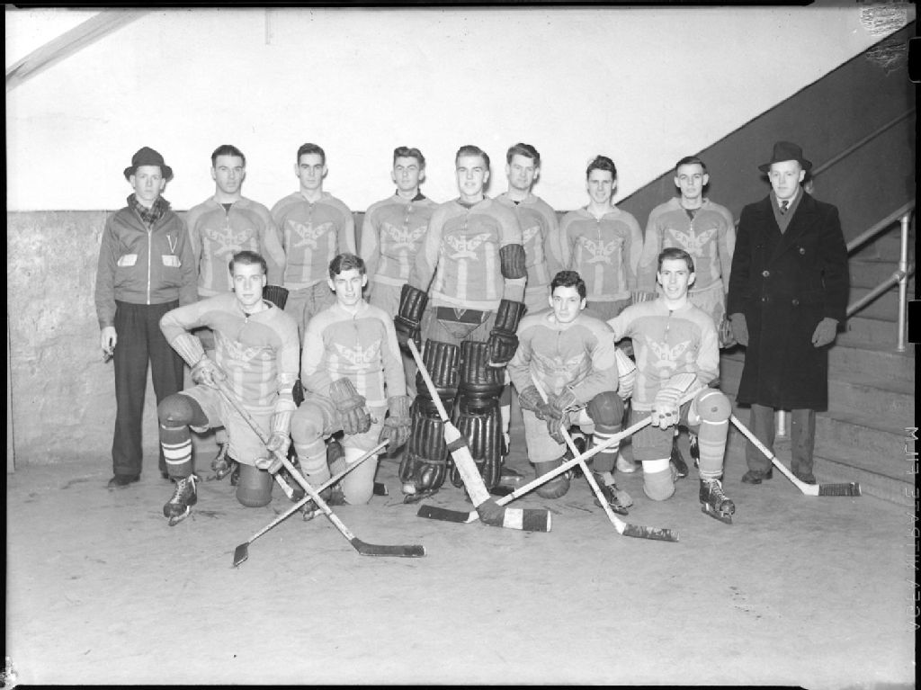 Nous voyons, posant sur une patinoire intérieure, les joueurs et les entraîneurs de l'équipe de hockey «The Eagles». Norman Richards en est le capitaine