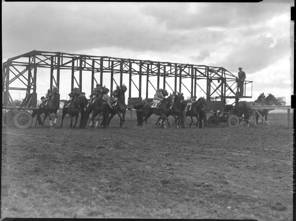 Nous voyons des chevaux de course quittant leurs stalles au départ d'une course sur la piste de l'hippodrome Mont-Royal, situé sur le Chemin Côte-de-Liesse à Ville Mont-Royal