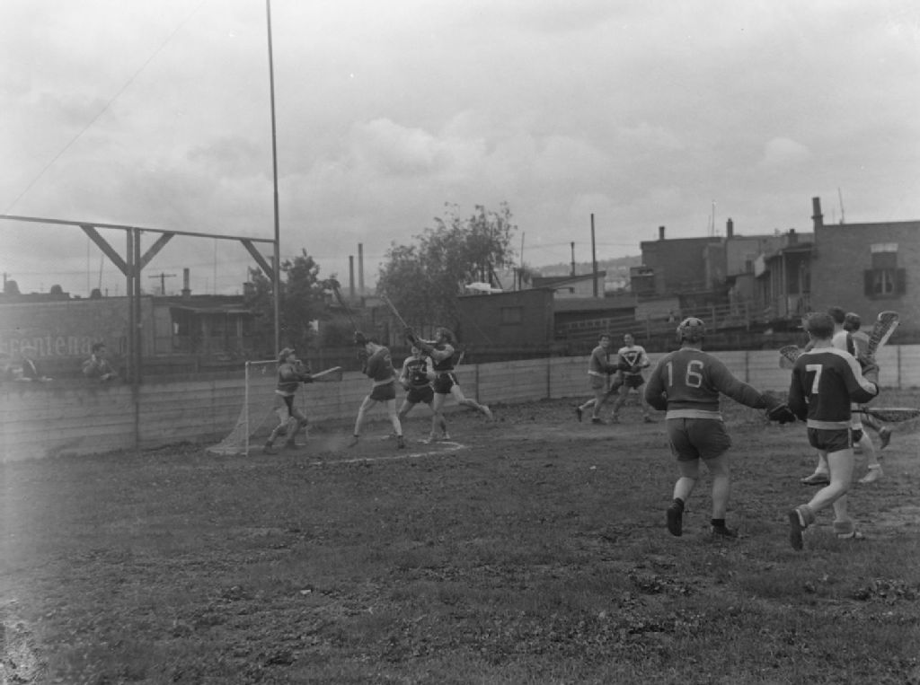 Nous voyons des joueurs des équipes de crosse du club social «St. Mary's» et des «Big Leaf» de Verdun s'affrontant lors d'un match au stade Notre-Dame de Montréal