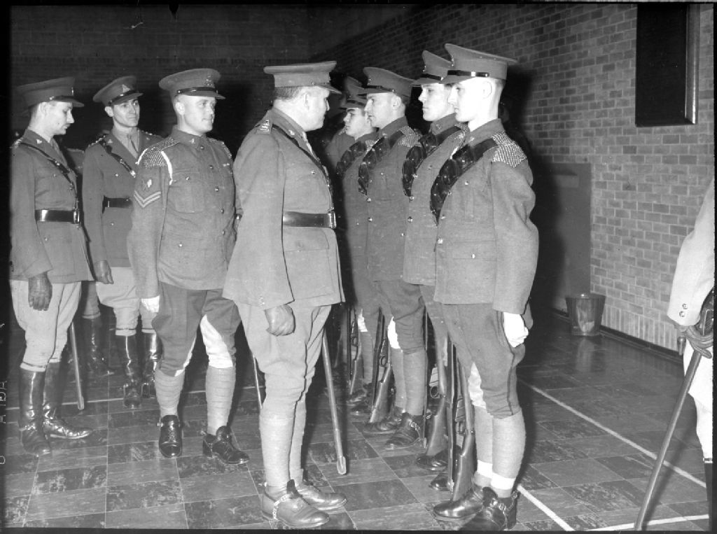Nous voyons, posant debout en uniforme au moment d'une revue des troupes, des officiers et des soldats du régiment «Duke's of York's Royal Canadian Hussars» dont la caserne se trouvait située au 4185, Chemin Côte-des-Neiges à Montréal