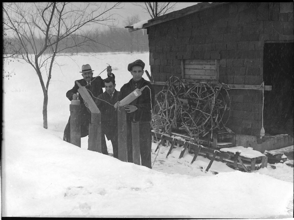 Nous voyons des ouvriers du commerce d'un fabricant de feux d'artifice, Donat Marroni, situé au 69, 7e avenue à Ville Saint-Pierre. Les employés de la «Montreal Fireworks Display Co» manipulent des pièces pyrotechniques à l'extérieur de l'usine