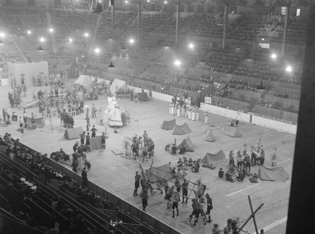 À l'occasion d'un jamboree scout, nous voyons plusieurs groupes de scouts en uniforme montant différents types de tentes sur le site d'un stade plein de spectateurs