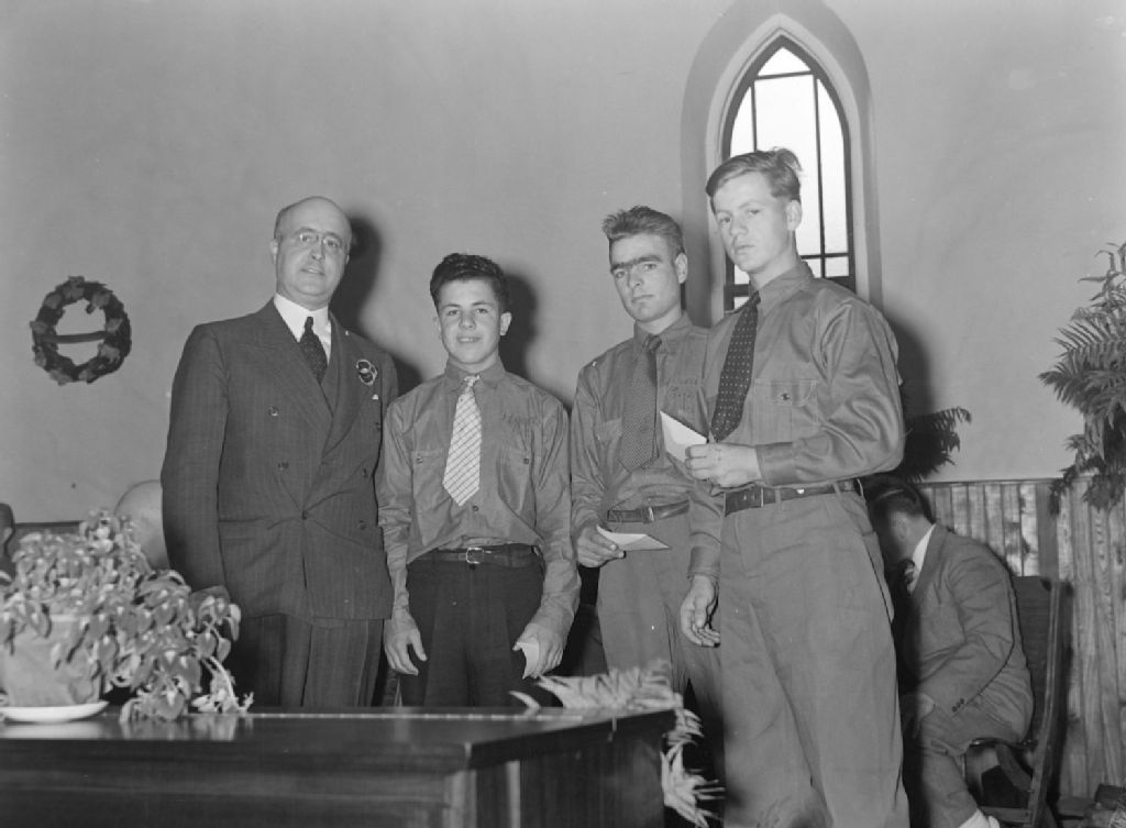Nous voyons trois jeunes diplômés en agronomie recevant un prix de vingt-cinq dollars chacun, dans l'église de Shawbridge (devenue Prévost) dans les Laurentides