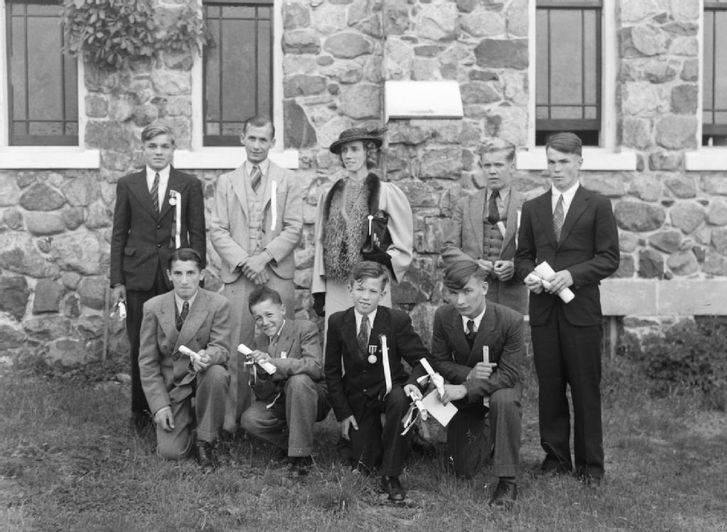 Nous voyons un groupe de jeunes diplômés en agronomie posant, diplôme en main, à l'extérieur de l'église de Shawbridge (devenue Prévost) dans les Laurentides