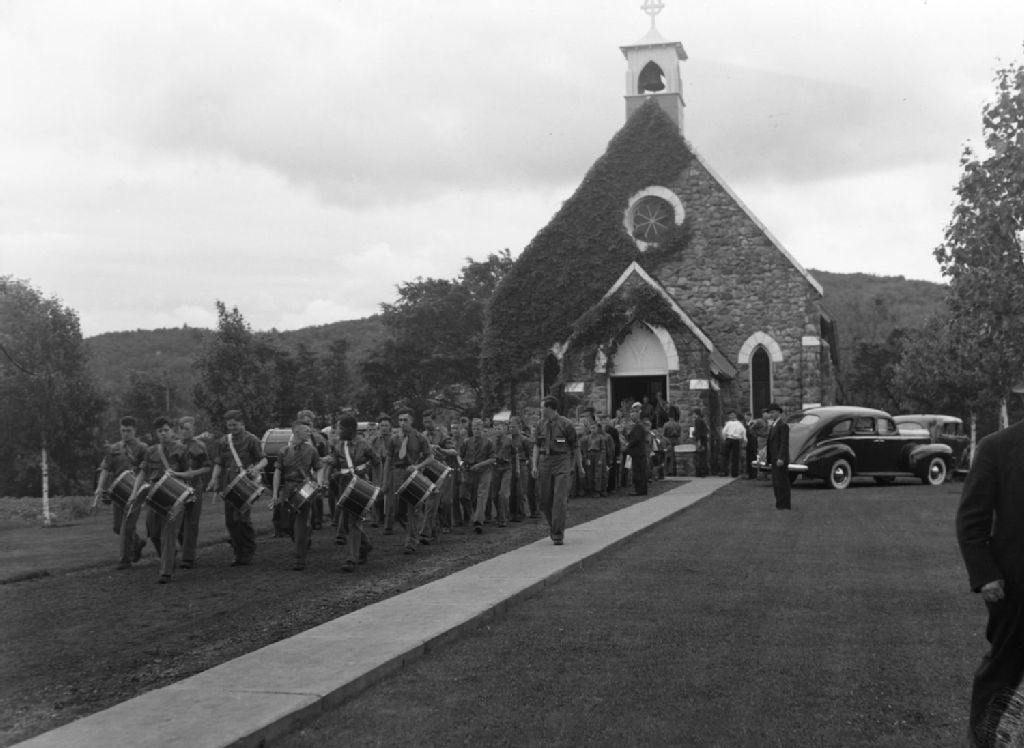 Nous voyons un groupe de jeunes diplômés en agronomie précédé d'une fanfare de tambours. Ils sortent de l'église de Shawbridge (devenue Prévost) dans les Laurentides