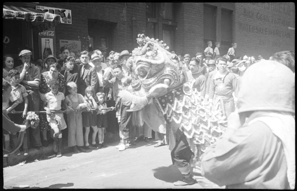 Nous voyons, lors d'un défilé sur la rue Clark dans le quartier chinois, des membres de la communauté chinoise en costume traditionnel transportant un dragon de papier. Nous apercevons des panneaux-réclame à l'arrière-plan