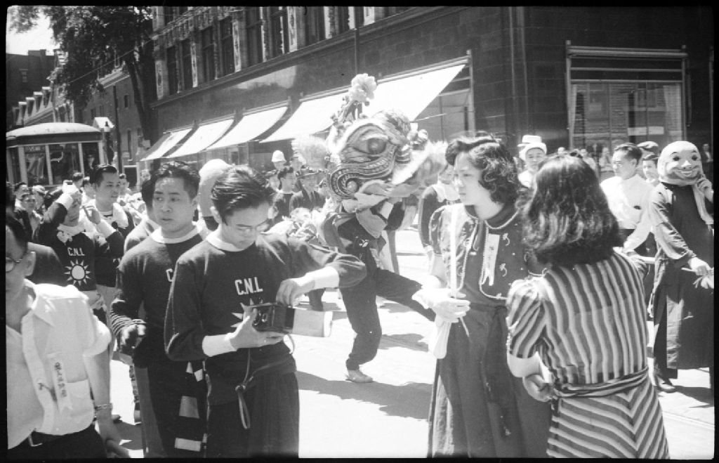 Nous voyons, lors d'un défilé à Montréal, des membres de la communauté chinoise en costume traditionnel portant une tête de dragon en papier. Nous apercevons un tramway à l'arrière