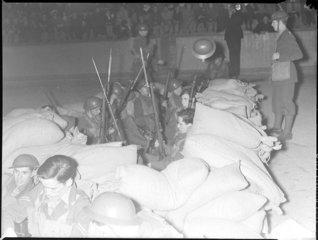 Nous voyons un exercice militaire fait par des soldats en tenue de combat dans le gymnase du collège Loyola, 7141, rue Sherbrooke Ouest à Montréal. Nous les apercevons couchés au sol et fusil en main derrière un amoncellement de sacs de sable
