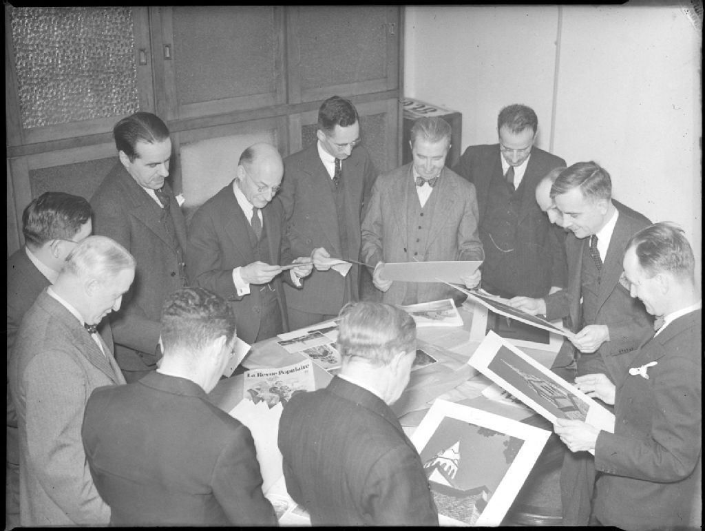 Nous voyons dans les locaux du journal Le Samedi un comité de juges autour d'une table sur laquelle se trouvent éparpillées plusieurs photographies. Quelques-uns des juges examinent des photographies de clochers d'églises et nous distinguons sur la table un exemplaire de la Revue populaire