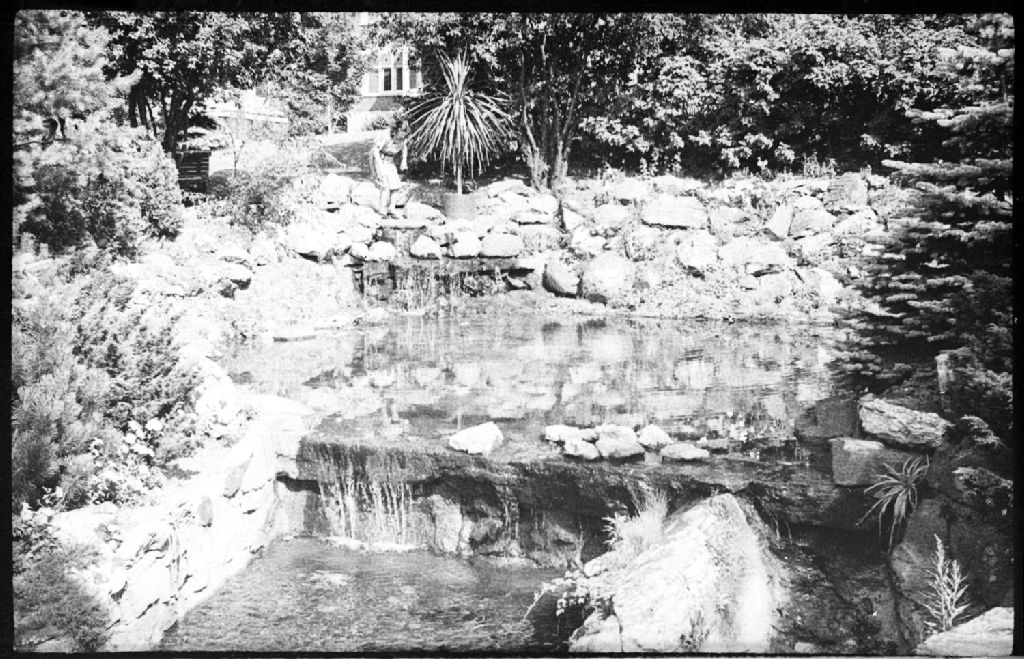 Nous apercevons une jeune femme au bord d'une cascade d'eau entourée de verdure. Ce plan d'eau se trouve au milieu du parc Pratt, situé entre l'avenue Pratt et l'avenue Dunlop à l'angle de l'avenue Van Horne à Outremont