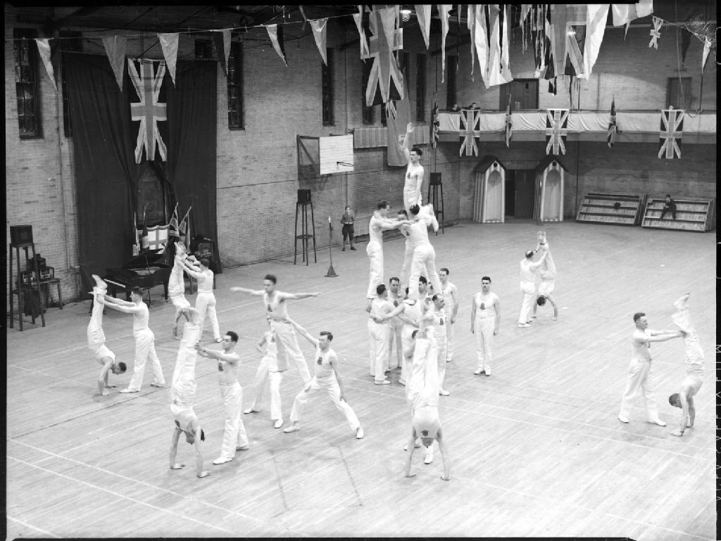 Nous voyons, en tenue sport, des policiers du corps de police de Westmount faisant des exercices d'équilibre et exécutant des pyramides dans un gymnase décoré de drapeaux. À l'arrière-plan, nous apercevons un piano à queue