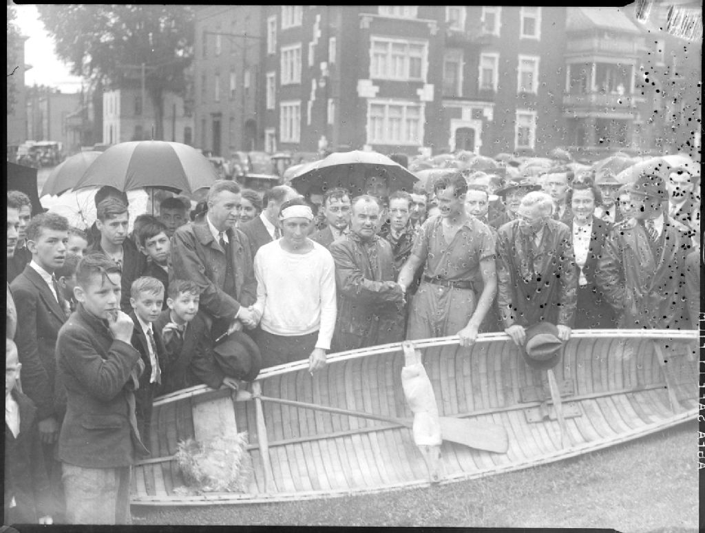 Nous voyons les gagnants d'une course de canots posant derrière leur embarcation lors des régates de Trois-Rivières. À l'arrière-plan, nous remarquons de nombreux spectateurs