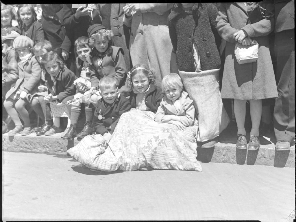 Nous apercevons des enfants assis sur un trottoir en attente du défilé du couple royal, le roi George VI et la reine Elizabeth, dans les rues de Montréal