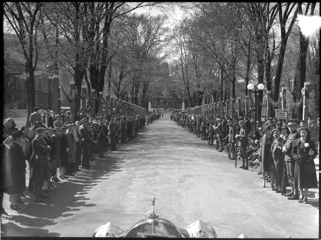 Lors de la visite du couple royal, de nombreux citoyens font une haie d'honneur à la limousine du roi George VI et de la reine Elizabeth à l'entrée de l'Université McGill sur la rue McGill College