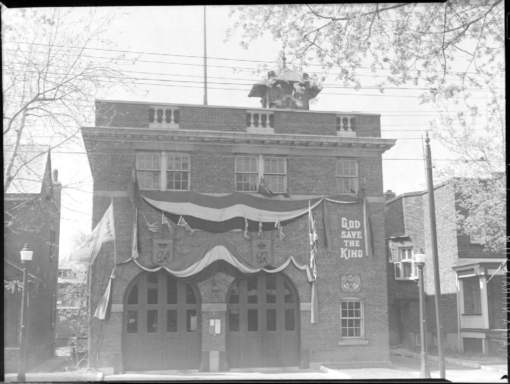 Lors de la visite du couple royal, le roi George VI et la reine Elizabeth, nous apercevons l'édifice abritant le poste de police et la caserne de pompiers de Montréal-Ouest, situé au 114, avenue Westminster. Nous remarquons sur la façade décorée l'inscription «God Save the King»