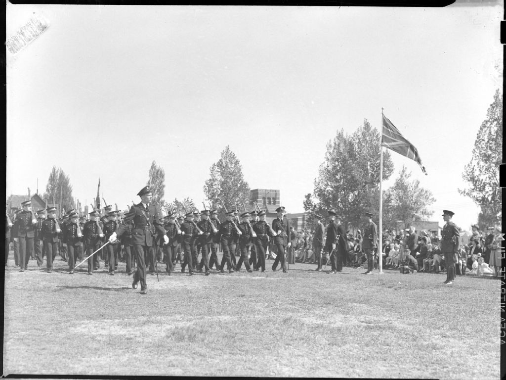 Nous voyons un défilé des élèves officiers du «Lower Canada College», situé au 4090, avenue Royal dans le quartier Notre-Dame-de-Grâce à Montréal. Ils sont passés en revue par des officiers supérieurs