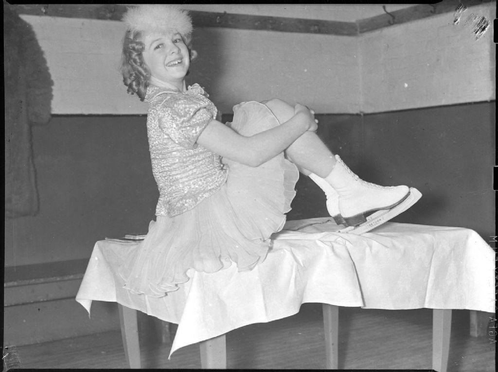 Nous apercevons, assise sur une table et portant costume et patins, une jeune patineuse artistique, Hazel Franklin. Ses patins, des Tretorn 2, ont été fabriqués en Suède