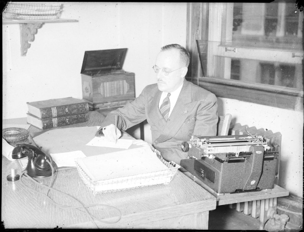 Nous voyons un reporter de la station radiophonique C.K.A.C., située au 980, rue Sainte-Catherine Ouest à Montréal. Il écrit à sa table de travail sur laquelle nous remarquons une machine à écrire de marque Royal, un téléphone et des volumes du Larousse Universel