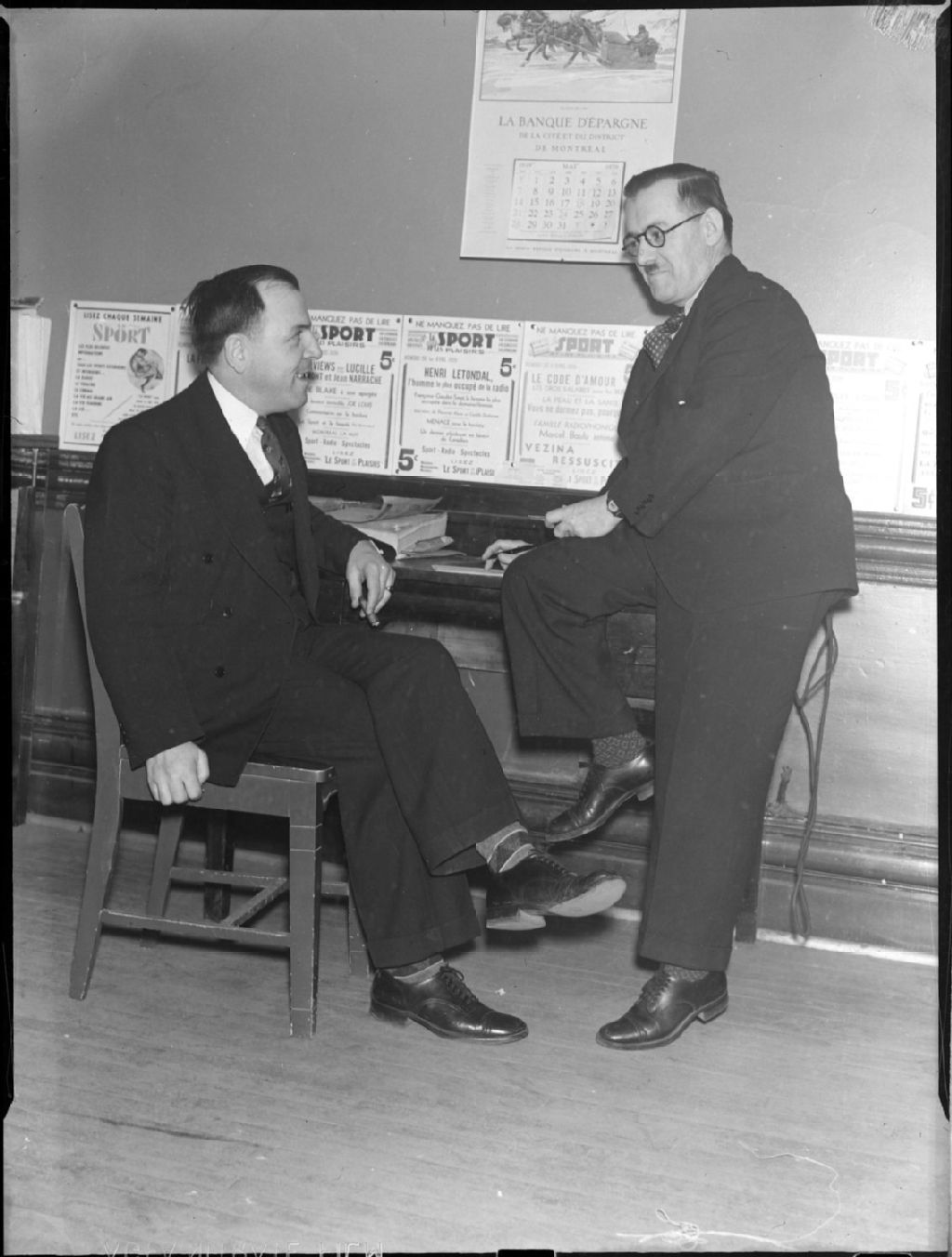 Nous voyons deux hommes dans un local du journal Le Sport, situé au 606, rue Cathcart à Montréal. Nous remarquons au mur plusieurs premières pages de cette publication