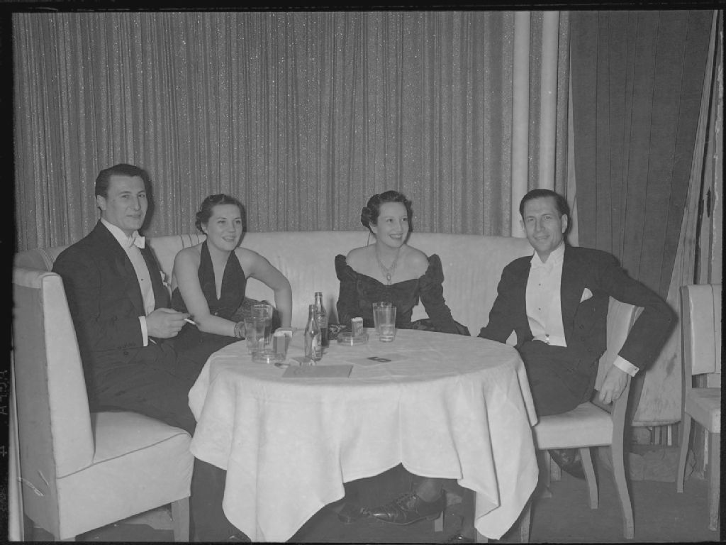 Nous voyons, posant autour d'une table dans la salle à manger du cabaret «Normandie Roof», madame et monsieur Pio de Fonville Éthier, Alice Morrie et Jacques Erwin