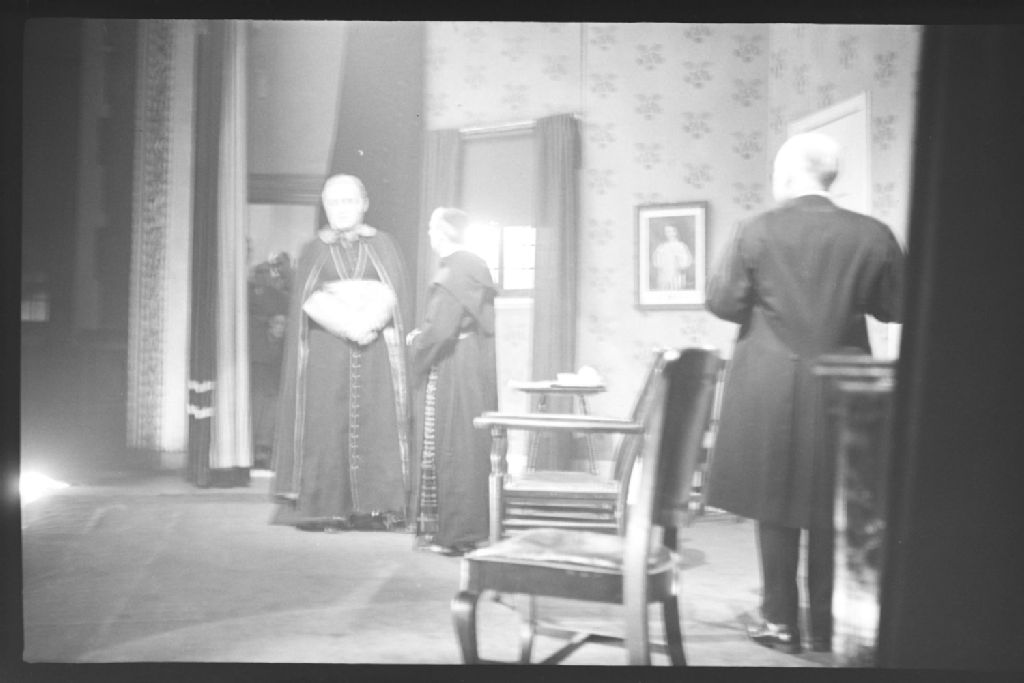 Lors de la représentation de «Father Malachy's Miracle», deux comédiens portant l'habit ecclésiastique et un autre vêtu d'une redingote se donnent la réplique