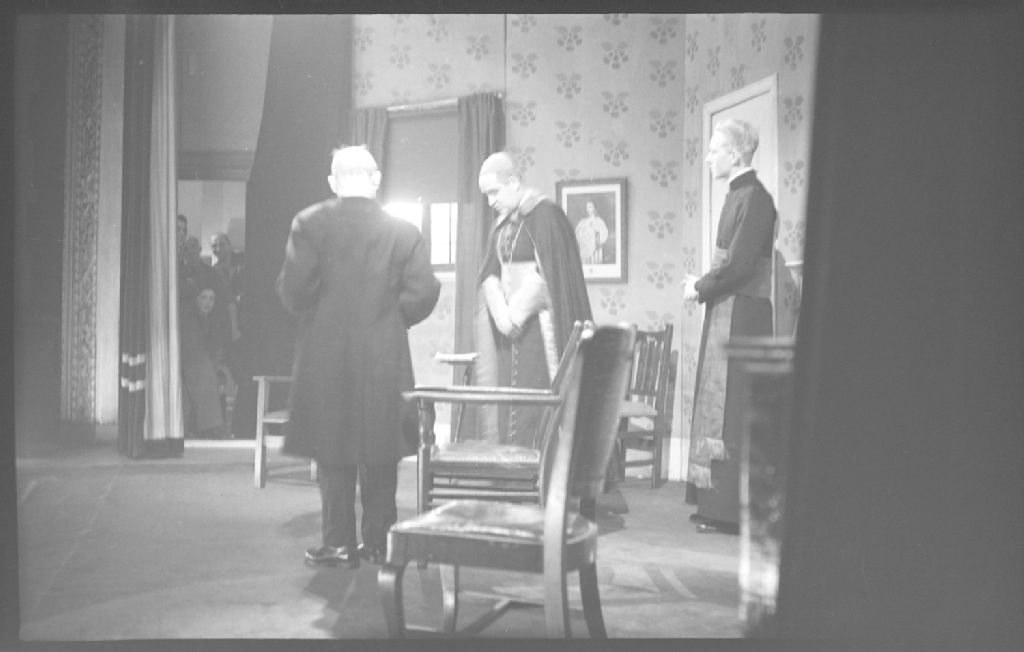 Lors de la représentation de «Father Malachy's Miracle», nous voyons deux comédiens portant l'habit ecclésiastique et un autre en redingote. Nous apercevons un groupe de comédiens en coulisses