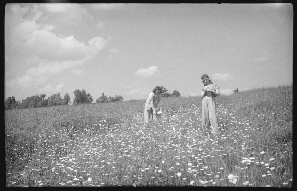 Deux jeunes filles, Eileen Greenwood et Frances Burroughs, cueillent des fleurs des champs