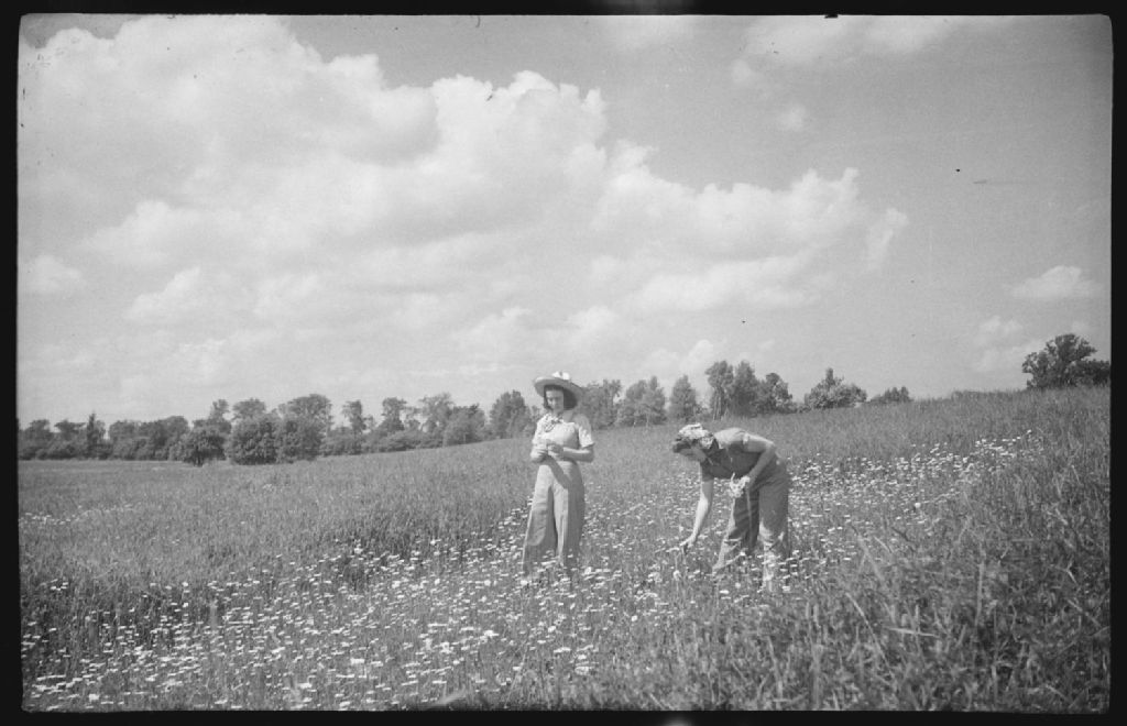Deux jeunes filles, Eileen Greenwood et Frances Burroughs, cueillent des fleurs des champs