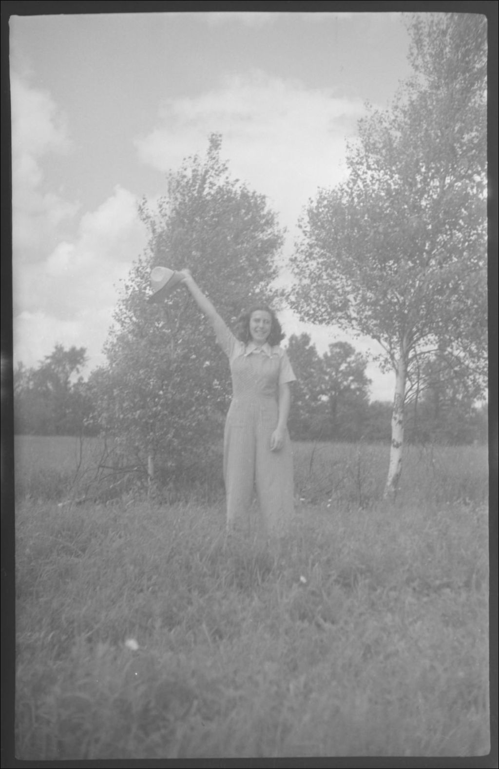 Une jeune fille en salopette, Eileen Greenwood, salue avec son chapeau de paille à bout de bras. Elle est au milieu d'un champ