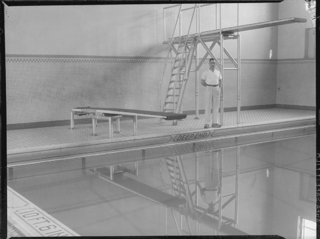 Monsieur Pilon, professeur de natation, posant en tenue de ville debout près des plongeons sur le bord de la piscine publique du quartier Notre-Dame-de-Grâce à Montréal