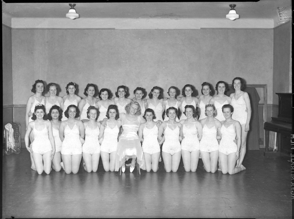 Nous voyons des étudiantes en nage synchronisée posant en maillot dans une salle du «North End Y.M.C.A.», situé au 5550, avenue du Parc à Montréal. Elles entourent leur professeur, Madame Iver. Nous apercevons un piano droit au fond de la pièce