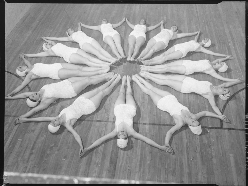 Des élèves en nage synchronisée exécutent une figure en forme de roue, jambes pointées vers le centre, allongées sur le parquet du gymnase du «North End Y.M.C.A.», situé au 5550, avenue du Parc à Montréal