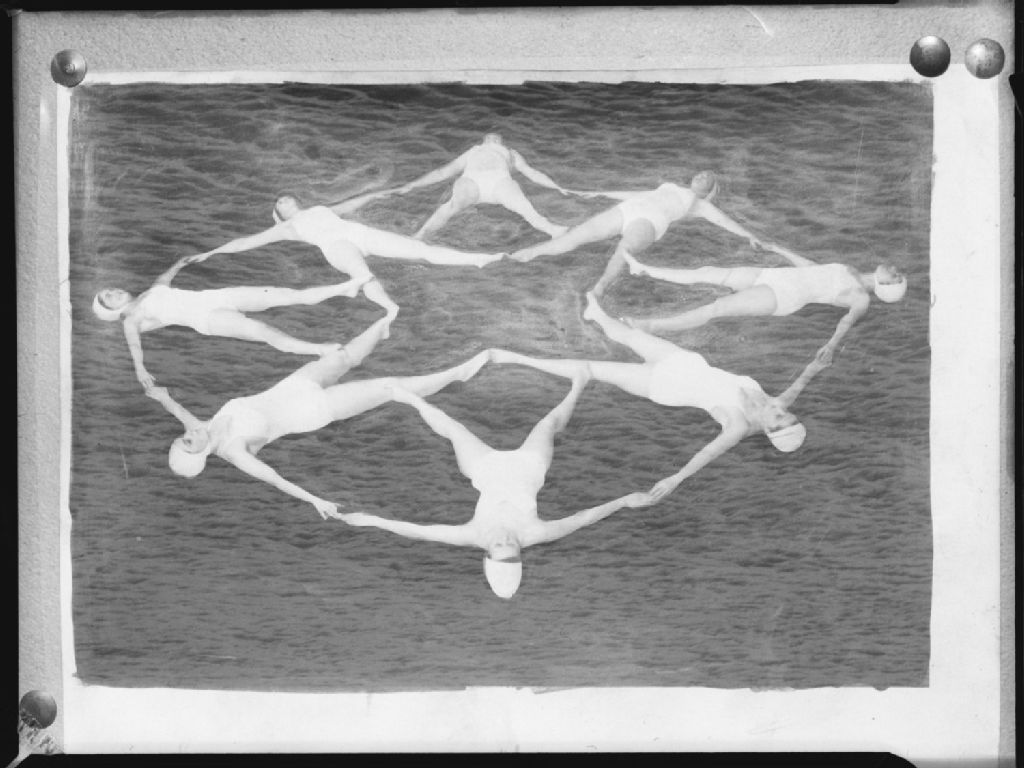 Des élèves en nage synchronisée exécutent une figure en forme d'étoile dans la piscine du «North End Y.M.C.A.», situé au 5550, avenue du Parc à Montréal