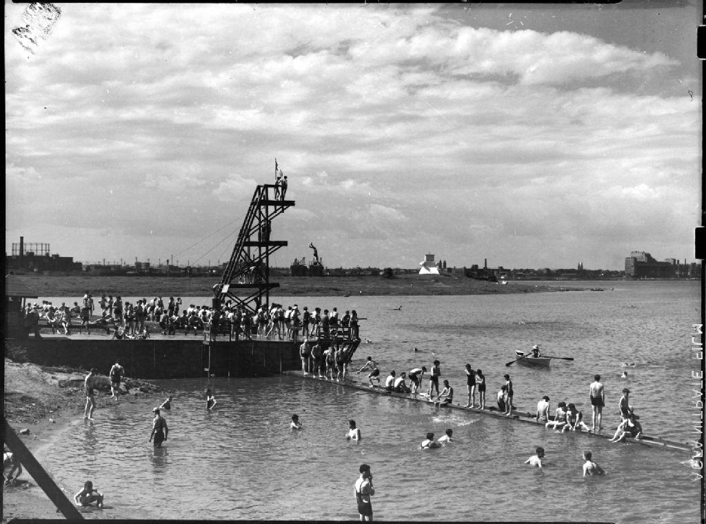 Nous voyons des baigneurs rassemblés sur le quai, autour du plongeoir à trois plate-formes du «Montreal Swimming Club» de l'Île Sainte-Hélène
