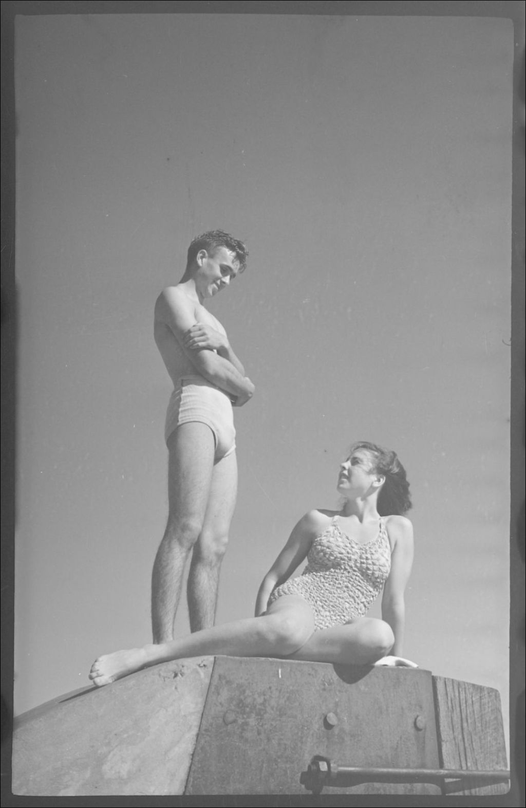 Swimming. Eileen Greenwood and Gawn McMahon, 1 août 1939, Archives nationales à Montréal, Fonds Conrad Poirier, (06M,P48,S1,P4534), Poirier, Conrad.