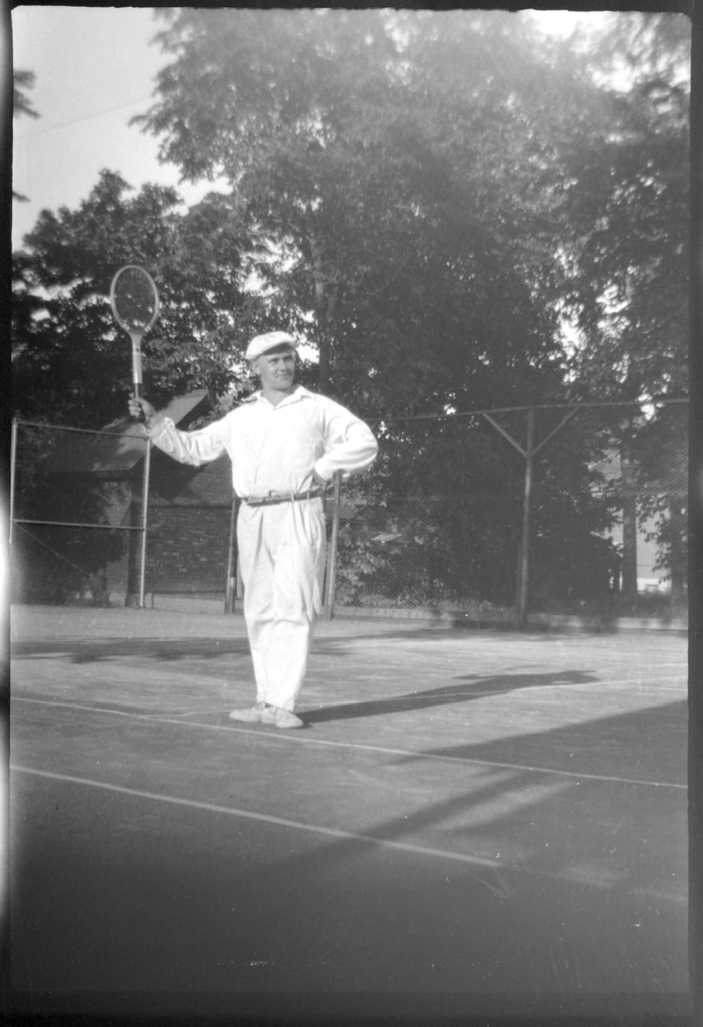 Conrad Poirier sur un terrain de tennis. Il tient dans la main une raquette de tennis